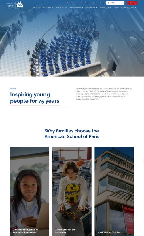 SEO and AI discoverability: Schema markup for local listings so ASP shows up when families search "international schools Paris." But we didn't stop at traditional SEO. We optimized for AI tools like ChatGPT since families increasingly use them to research schools. Compressed images, cleaned up unused CSS, ensured accessibility standards.